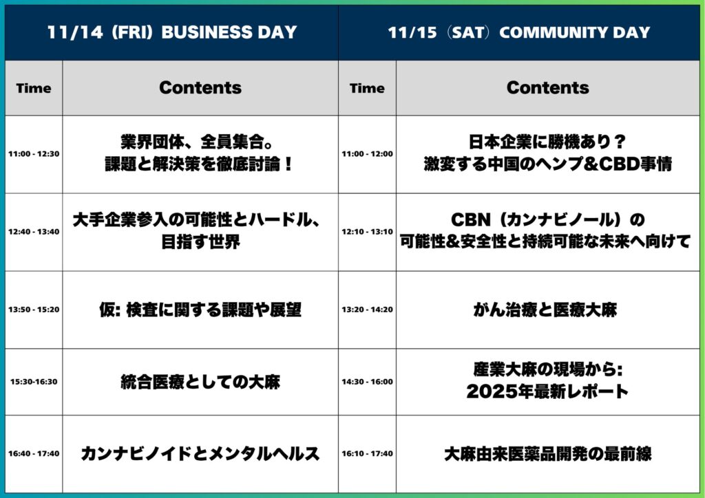 国内外約100社が集結する展示(最新のCBD・ヘンプ製品など)に加え、国内外の専門家が登壇する2つのカンファレンスも同時開催。健康食品から建材、繊維まで、多様な分野でのビジネスチャンスと産業の未来を探る重要な機会となりそうです。